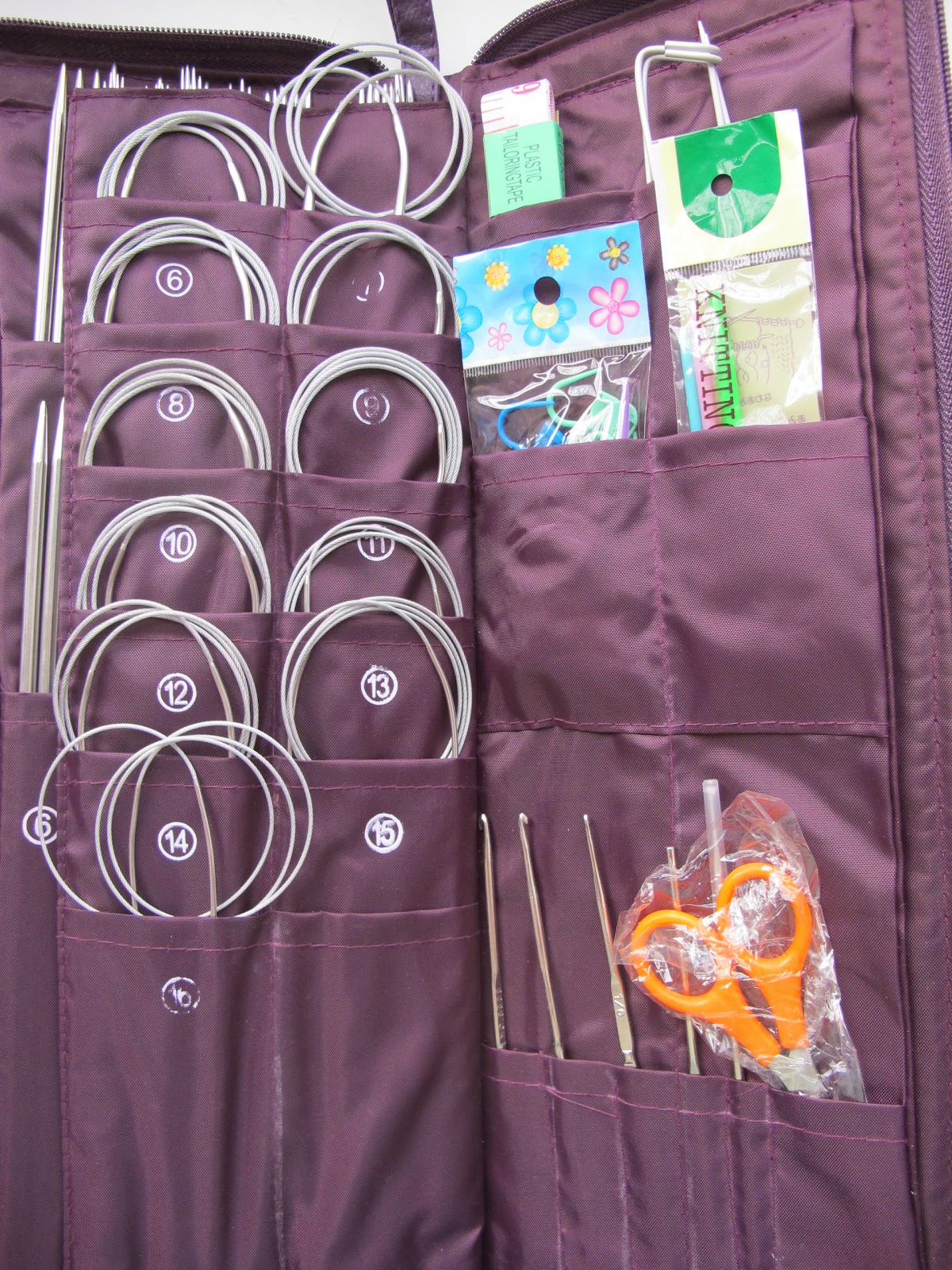 Крючки, ножнички, маркеры, метр, булавки для снятия петель и спицы для кос.
